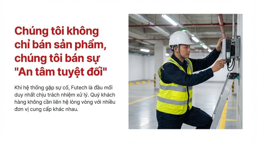 Hiểu rõ điều này, Futech xây dựng chính sách bảo hành nghiêm ngặt, minh bạch và chuyên nghiệp cho toàn bộ hệ sinh thái giải pháp đa dạng (Giao thông thông minh, An ninh giám sát, Điện nhẹ ELV, Bãi xe...), cam kết đồng hành cùng Chủ đầu tư giải quyết mọi sự cố phát sinh một cách nhanh chóng nhất.