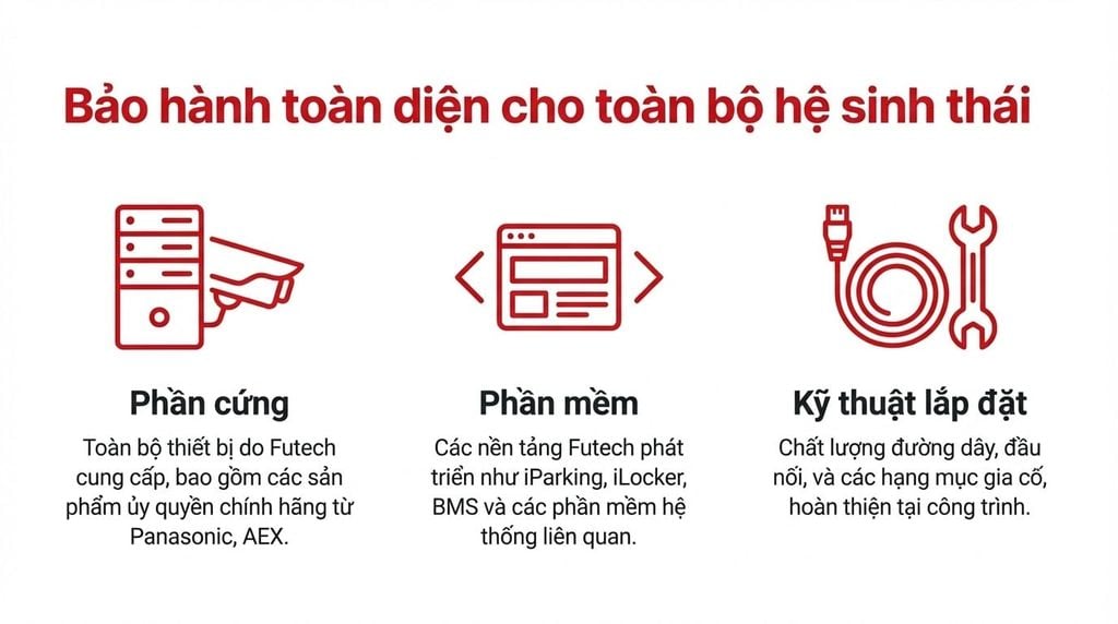 - Bảo hành các dự án do Futech triển khai: Bao gồm toàn bộ hệ sinh thái giải pháp (Giao thông thông minh, An ninh giám sát, Điện nhẹ ELV, Bãi xe, Tủ locker...).