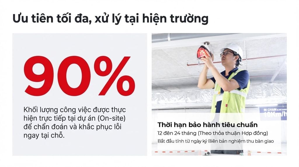 - Nghiệm thu & Bàn giao: Sau khi sự cố được khắc phục, kỹ thuật viên vận hành thử tải, khách hàng ký xác nhận hệ thống đã hoạt động ổn định trở lại.