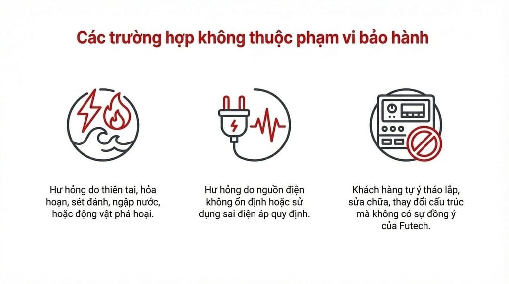 - Khách hàng tự ý tháo lắp, sửa chữa, thay đổi cấu trúc thiết bị hoặc phần mềm mà không có sự đồng ý bằng văn bản của Futech.