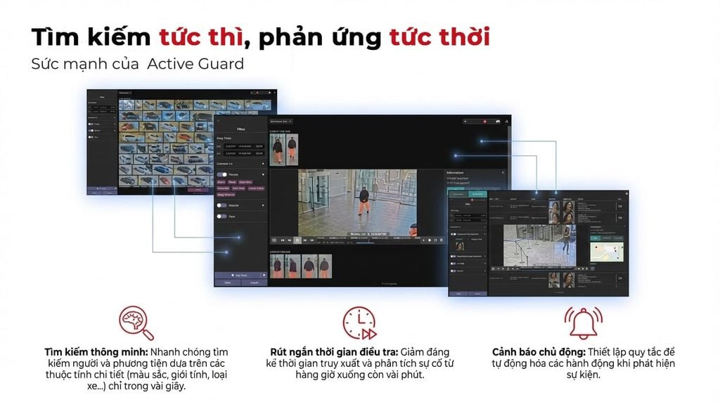 - Bảo vệ Chu vi (Perimeter Protection): Thiết lập hàng rào ảo bảo vệ nhà máy, kho bãi. Hệ thống tự động phân biệt người/xe và gửi cảnh báo xâm nhập chuẩn xác,...