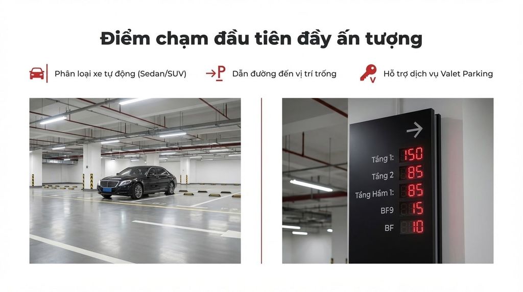 Hệ thống cảm biến siêu âm/camera tại từng vị trí đỗ kết hợp bảng LED điều hướng giúp khách hàng tìm thấy chỗ trống gần nhất trong tích tắc, tránh việc lái xe lòng vòng gây ức chế.