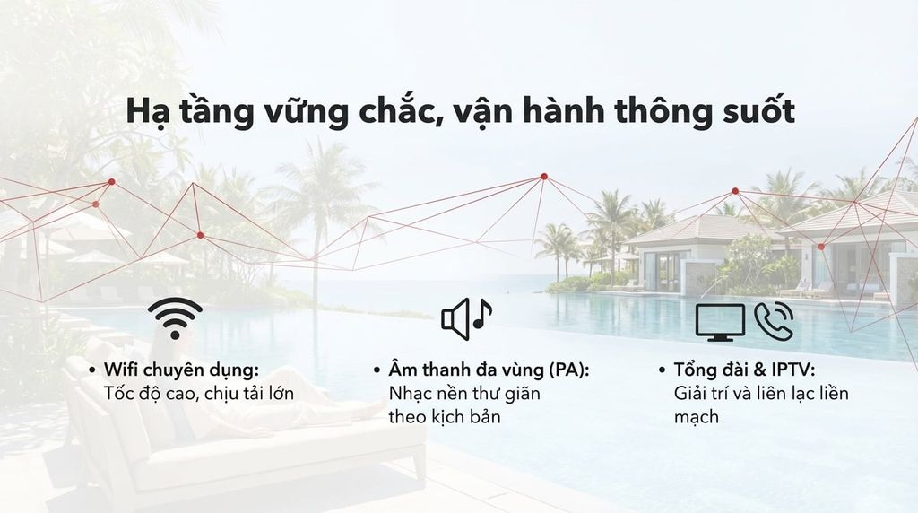 - Hệ thống Âm thanh đa vùng (PA): Phát nhạc nền (BGM) thư giãn theo kịch bản (Sáng/Chiều/Tối) tại sảnh, hành lang, nhà hàng, tạo không gian nghỉ dưỡng đẳng cấp.