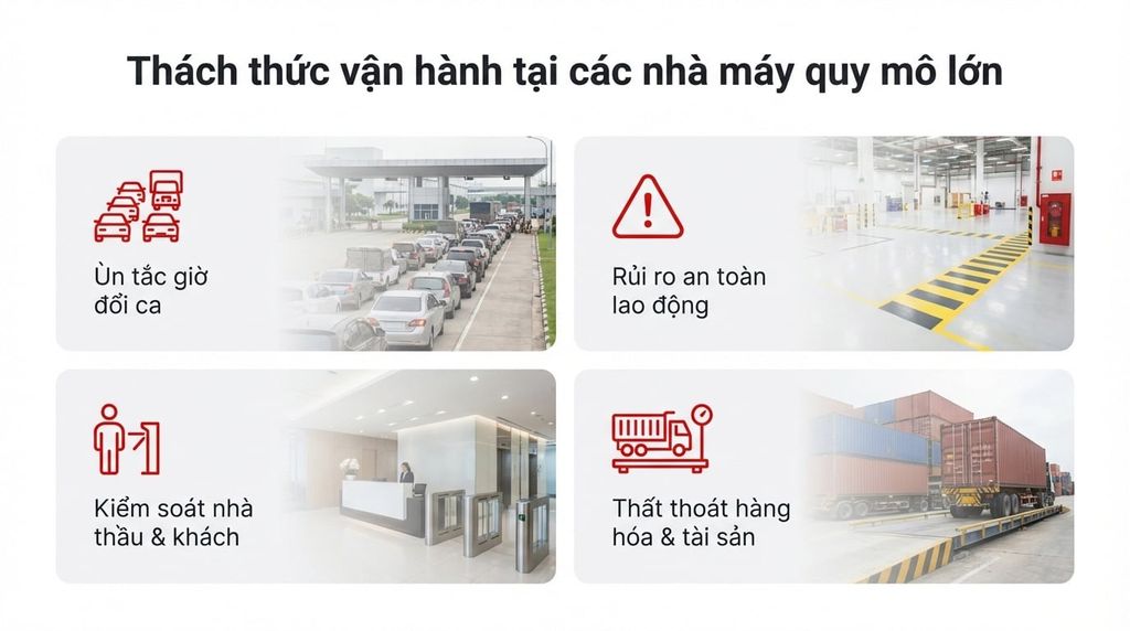 Đối với các Nhà máy sản xuất quy mô lớn và các Khu công nghiệp, bài toán quản lý không chỉ dừng lại ở an ninh. Việc vận hành trơn tru hàng chục nghìn công nhân, kiểm soát chính xác hàng trăm lượt xe container, đảm bảo an toàn lao động và tối ưu hóa các tiện ích nội khu (canteen, tủ đồ...) là những thách thức sống còn ảnh hưởng trực tiếp đến hiệu suất sản xuất.