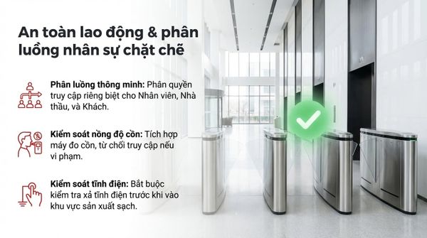 - Kiểm soát nồng độ cồn: Tích hợp máy đo cồn vào hệ thống cửa xoay. Nếu nhân viên thổi có nồng độ cồn -> Cổng không mở -> Gửi cảnh báo tức thì cho bộ phận an toàn.