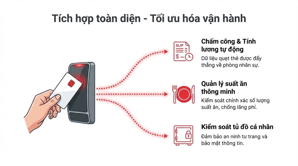 - Kiểm soát Suất ăn: Nhân viên quẹt thẻ hoặc nhận diện khuôn mặt để nhận suất ăn. Hệ thống giúp nhà bếp kiểm soát số lượng suất ăn thực tế, tránh lãng phí hoặc gian lận suất ăn.