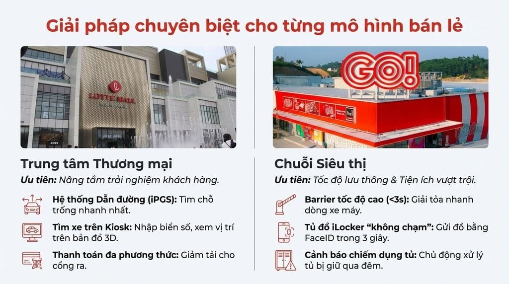 Đối với các TTTM quy mô lớn (như Aeon Mall, Lotte Mall), ưu tiên hàng đầu là Trải nghiệm khách hàng và Quản lý bãi xe khổng lồ.