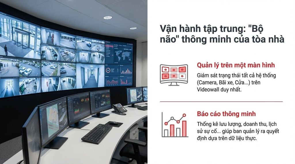 - Phần mềm quản lý trung tâm (CMS): Giám sát trạng thái hoạt động của tất cả các hệ thống con (Camera, Bãi xe, Cửa, Báo cháy) trên một màn hình Videowall duy nhất.