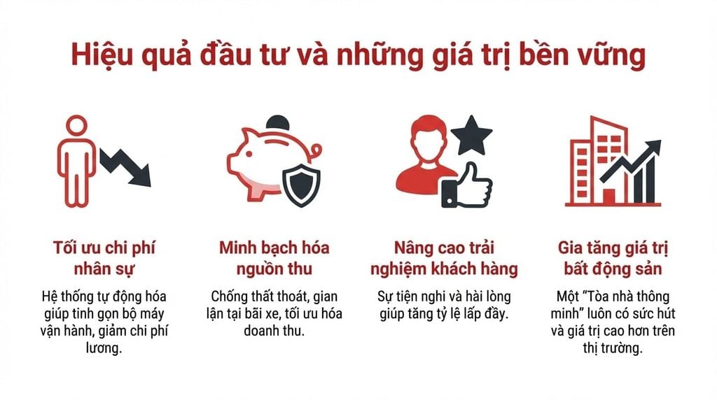 - Tối ưu hóa chi phí nhân sự: Hệ thống tự động hóa giúp tinh gọn bộ máy vận hành, giảm bớt sự phụ thuộc vào nhân viên trực tại các chốt bảo vệ hay quầy lễ tân, từ đó tiết kiệm chi phí lương đáng kể cho Ban quản lý.